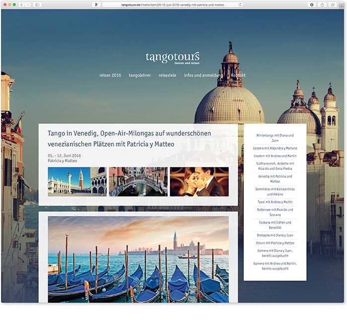 tangotours organisiert Reisen und das schon seit 15 Jahren. Nun war ein relaunch der website gewünscht. Enstanden ist eine bunte, bildstarke Seite, die Lust macht auf Reiseziele von Usedom, über den Bodensee, die Ardèche und Südfrankreich, nach Apulien, Lipari und Gomera.